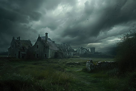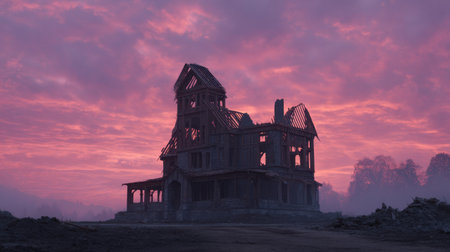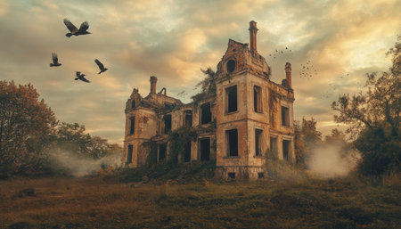 Hauntingly beautiful scene of decrepit house ruins with birds, showcasing nature s resilience