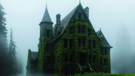 Discover a captivating image of a mysterious abandoned mansion covered in green ivy, shrouded in atmospheric fog, surrounded by a dense forest landscape.