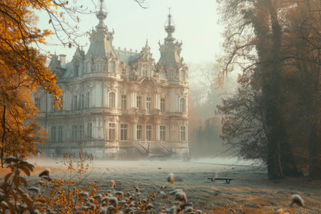 A fog-covered, historical mansion stands quietly among trees, showcasing its stunning architecture and rich history.