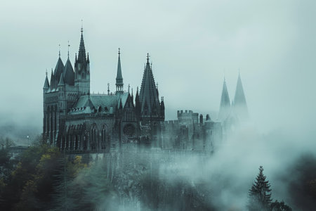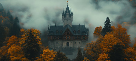 A castle emerges from the misty fog, commanding attention in the heart of a lush forest, Gothic vampire castle enveloped in fog, AI Generated
