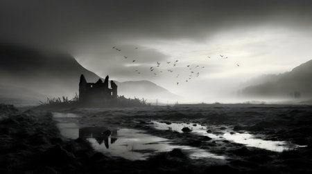 The forlorn ruins of a medieval tower loom through a dense fog, standing as a silent witness to history on a desolate moor.