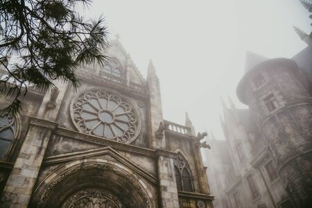 A castle with a foggy sky in the background. The castle is old and abandoned. The fog is thick and heavy, giving the scene a mysterious and eerie atmosphere
