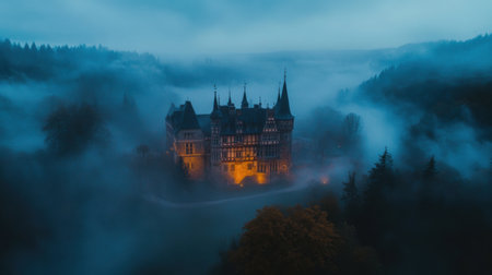 In the twilight, a grand castle stands out with its warm lights against a backdrop of rolling fog. The surrounding forest adds to the mystical atmosphere, enhancing the enchantment of the scene.