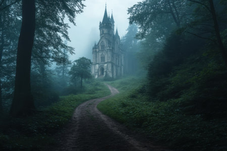 A winding path through a dense forest reveals a mysterious castle shrouded in fog at dawn.