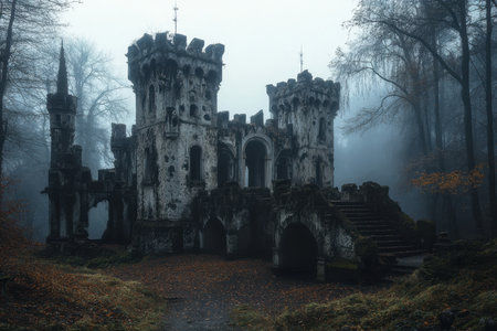 A mysterious, crumbling castle stands in a fog-drenched forest, with autumn leaves scattered on the ground.