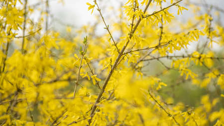 Yellow flowering Forsythia bush in spring. Selective focus. Background with copy space for text or inscription