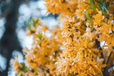 Beautiful blooming forsythia bush. Close up of yellow flowers. Nature closeup