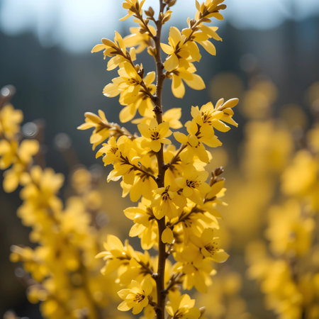 A Vibrant Close-Up View of a Forsythia Branch in Full Bloom, Bursting with Radiant Yellow Flowers Signaling the Joyous Arrival of Spring