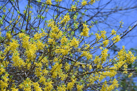 Yellow blooming Forsythia flowers in spring, blue sky on background. Natural spring background