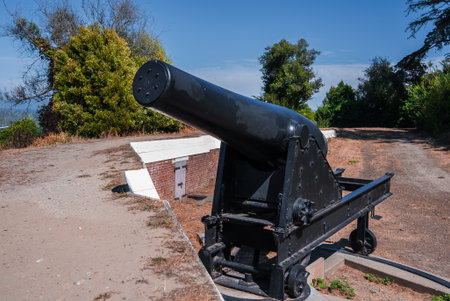 Falmouth, Cornwall, England - July 25, 2018: Big gun at Pendennis Castle in Cornwall, England. Pendennis castle was first commissioned by King Henry VIII in response to invasion threats from the continent. Pendennis was built on the mouth of the River Fa