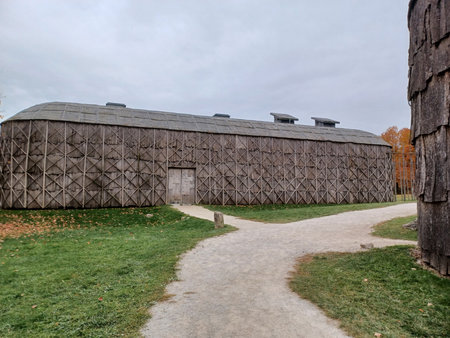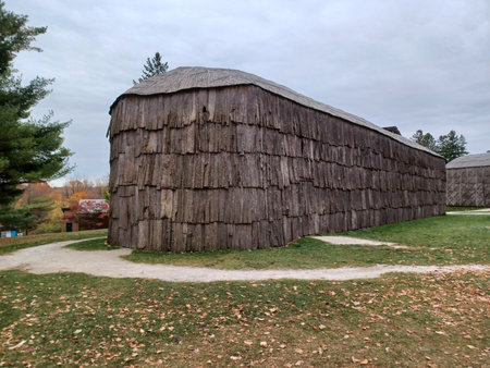 Ontario, Canada - July 5, 2025: A large historical longhouse building made of bark sits under a cloudy sky.