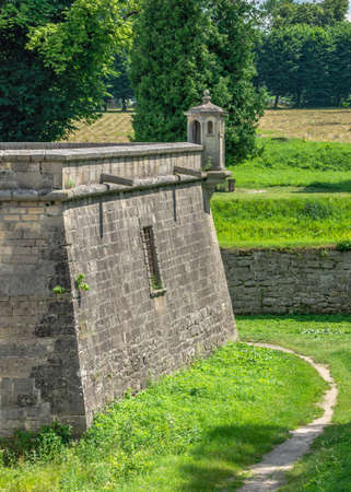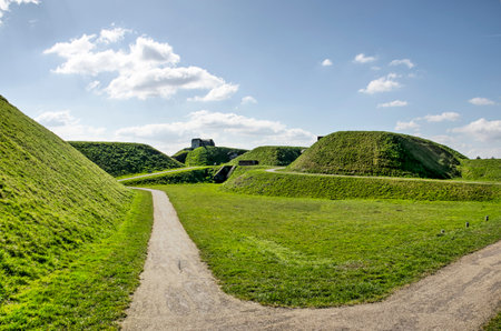 Hellevoetsluis, The Netherlands, March 19, 2021: military landscape with artificial hills and strongholds on the ramparts around the historic naval harbor