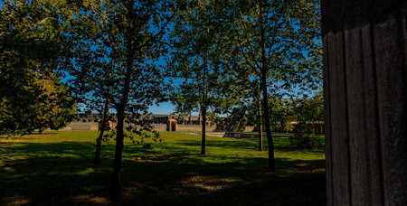 Palestra grande or athletic field in the pompei archeological site, looking through the trees towards the meadow and city wall