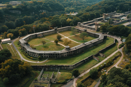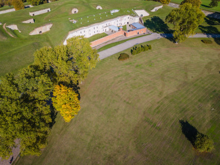 Ninth fort in Kaunas, Lithuania. Kaunas IX Fort Museum. A monument and memorial to victims of Nazism during world war two. Aerial drone view photo