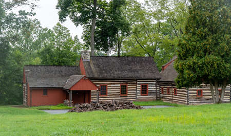 Birdsboro, Pennsylvania - August 20, 2021: A historic log cabin in the forest at the Daniel Boone Homestead.