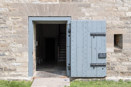 Louisbourg, Canada - September 20, 2018: Historic buildings in the fortress of Louisbourg, Cape Breton island, Nova Scotia, Canada