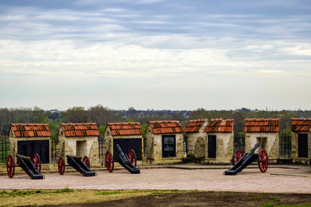Imitation of ancient cannons on site of an ancient fortress against the backdrop of overcast sky. Outdoors decoration. Copy space. Selective focus.