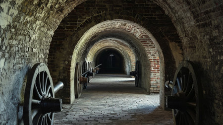 Tunnel archway passage with brick walls and cannon guns