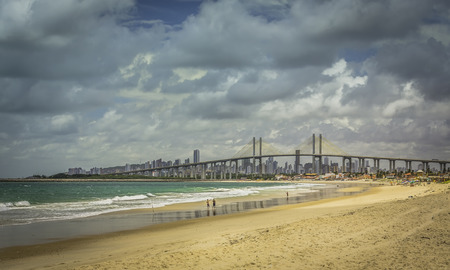 Beautiful beach of the brazilian northeast, view to the beach and the city buildings on the background. Boa Viagem beach in Recife, PE, Brazil.