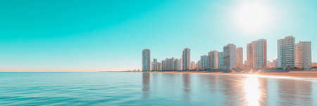 Panoramic view of a coastal city skyline at sunrise with sunlight reflecting on the calm ocean water, creating a serene and peaceful atmosphere