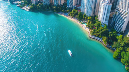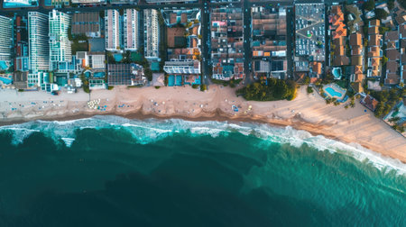 A stunning aerial view captures a tranquil beach scene alongside a vibrant cityscape, showcasing calm blue waters, sandy shores, and vibrant greenery.