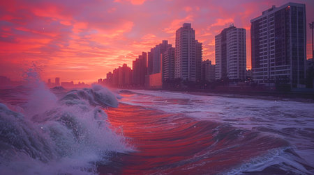 Behold the captivating spectacle of a sunrise over an urban beach An expanse of red and pink sky washes over the scene like crashing waves, casting an ethereal glow upon the modern buildings that line the shore The gentle roar of the ocean complements the breathtaking visual symphony as the first rays of dawn illuminate the coastal paradise AI Generative