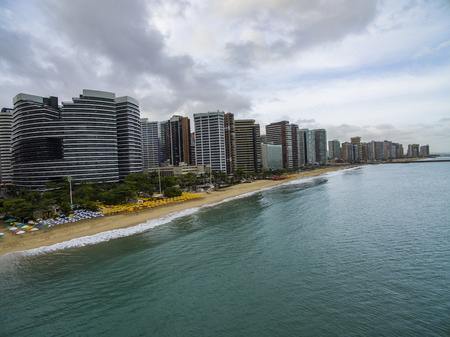Cityscape scene depicting the coastline beach surrounded by modern modern buildings in Fortaleza, Brazil