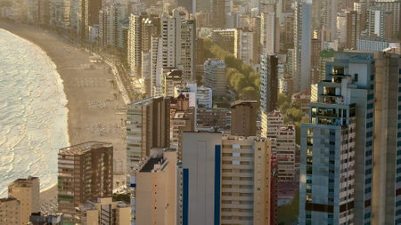 A beautiful aerial view of a vibrant city by the beach during sunset, showing urban life and nature.