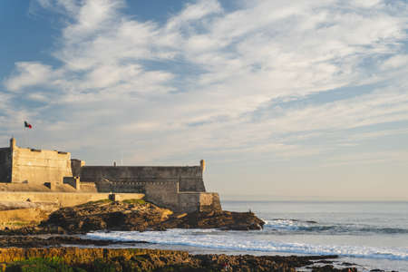 View of Saint Julian Fortress with lighthouse tower from beach (praia) of Carcavelos, Portugal. Ocean waves from the Atlantic, and eroded beach rocks.