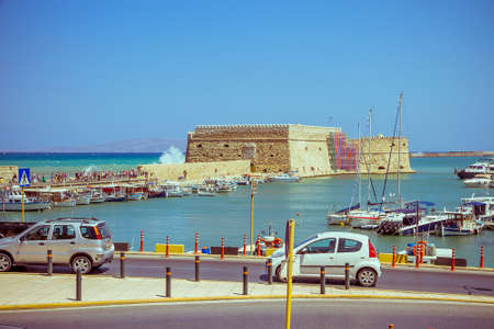 Crete Heraklion August 25: Venetian fortress Koules in city traffic on August 25, 2015 in Heraklion. City is with 175.000 inhabitants capital on Crete