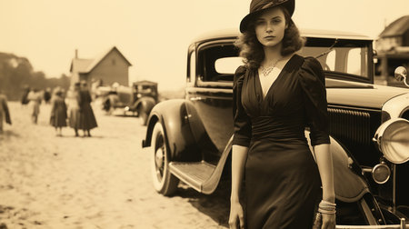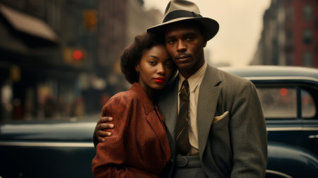 A stylish couple, dressed in formal vintage fashion reminiscent of the 1940s, walks hand-in-hand down a cobblestone street. The man wears a pinstripe suit and fedora, while the woman wears a tweed jacket, floral skirt, and gloves, with a vintage car parked in the background.