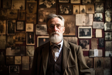 A man stands in front of a wall filled with black and white photos. This image can be used to represent nostalgia, memories, or the passage of time.