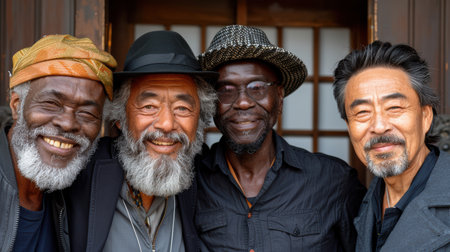 Elderly individuals are sharing joyful laughter in a black and white portrait, capturing the essence of happiness and connection among friends.
