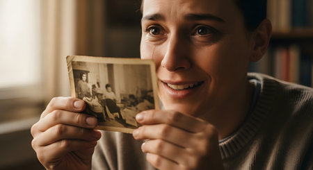 A woman with tears in her eyes smiles warmly while looking at an old, sepia-toned photograph. The bittersweet emotion on her face suggests nostalgia, cherished memories, and remembering a loved one from the past.