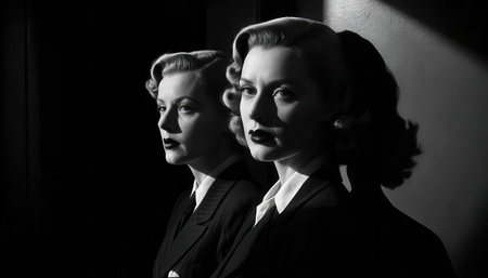 A captivating black and white portrait featuring two elegantly styled women, showcasing vintage fashion, classic hairstyles, and striking expressions that evoke nostalgia and sophistication.
