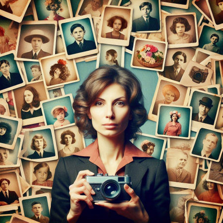 A person examines an old portrait in a collection of vintage photographs, surrounded by aged images and memorabilia, evoking nostalgia and curiosity about the past.