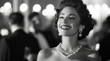 A woman in a luxurious evening gown wearing a stunning set of pearl earrings and necklace, smiling confidently at a glamorous event.