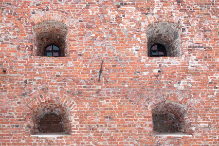 windows in niches on an old brick wall of ancient fortress or prison
