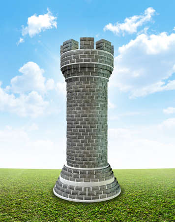 A monolithic chess castle on a perfect flat green lawn against a blue sky with white clouds