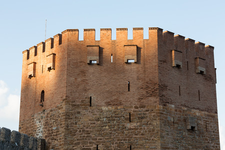 well-preserved towers of the old medieval castle of red brick against a blue sky