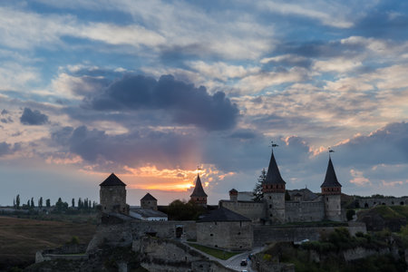 Ancient fortress of the 14-18th centuries in Kamianets-Podilskyi, Ukraine. General view from the Old Town against the cloudy sky in autumn evening before sunset.