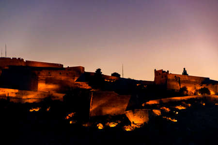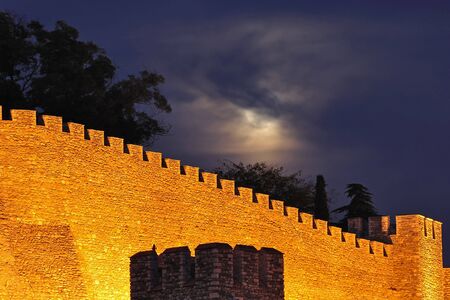 Night shot of a illuminated wall of medieval fortress Kale, Skopje