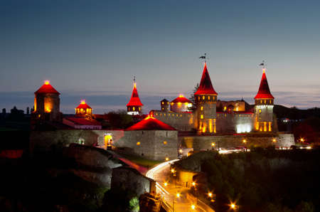 Old Castle Kamenetz-Podolsk - medieval castle, one of the historical monuments of Ukraine. View of a beautiful castle at night.