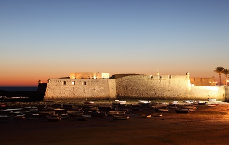 Castle of San Sebastian in Cadiz illuminated at night. Andalusia, Spain