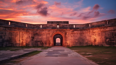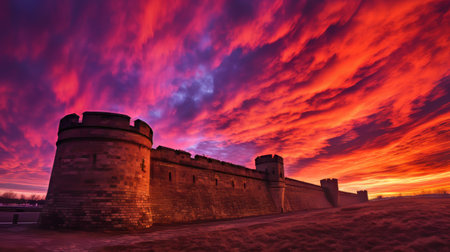 The towering stone structure showcases medieval architecture under a colorful sunset backdrop.