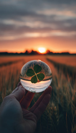 A hand cradles a clear glass sphere containing a four-leaf clover, reflecting a sunset over a field. Warm tones of orange and gold dominate the scene, with the sphere's curvature distorting the background. This image could be used for various commercial or editorial purposes, conveying concepts of fortune and nature.