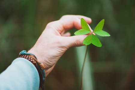 man hand holding an exotic green clover leave. Green blurred background