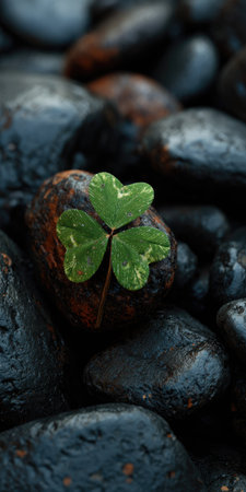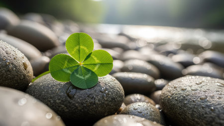 A vibrant green shamrock sits atop a weathered brown stone, surrounded by a bed of dark, wet pebbles. The composition features a shallow depth of field, highlighting the shamrock and stone against the blurred background. The image evokes a sense of tranquility. It is suitable for various commercial or editorial uses.