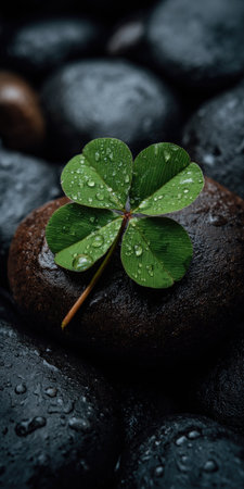 A detailed image features a four-leaf clover, showcasing vibrant green leaves with water droplets. The clover rests on a weathered, textured surface, possibly a rock, suggesting an outdoor setting. The composition uses selective focus, highlighting the clover. This image is suitable for various commercial uses, including illustrations and designs.
