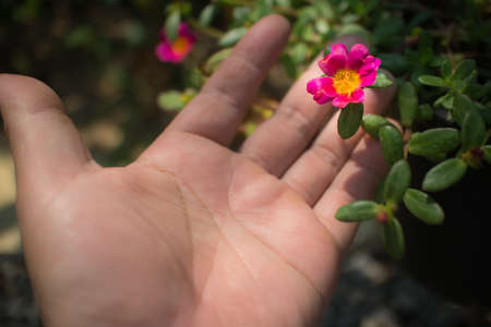 Close up of Common Purslane flower with small green leaf on hand